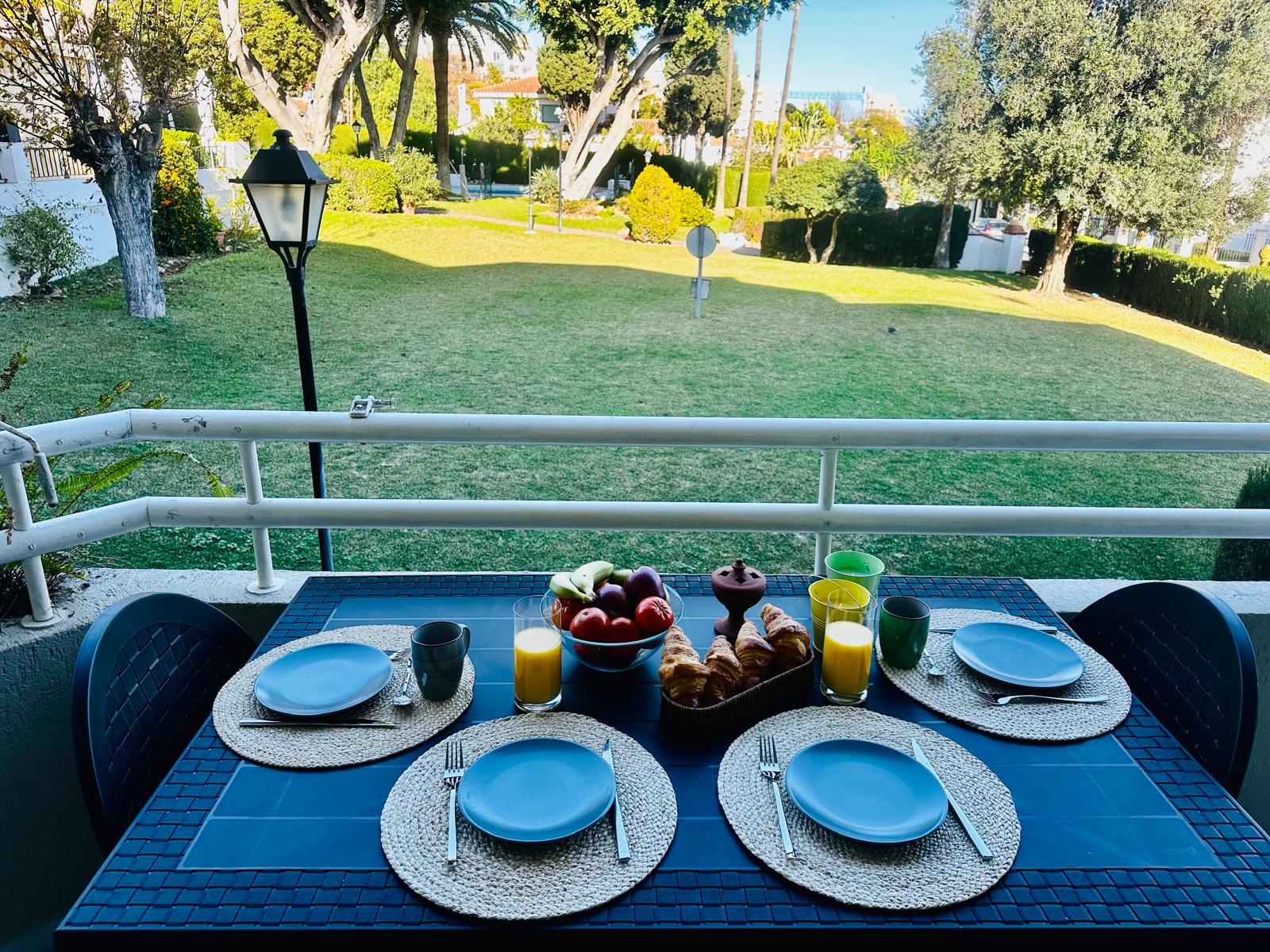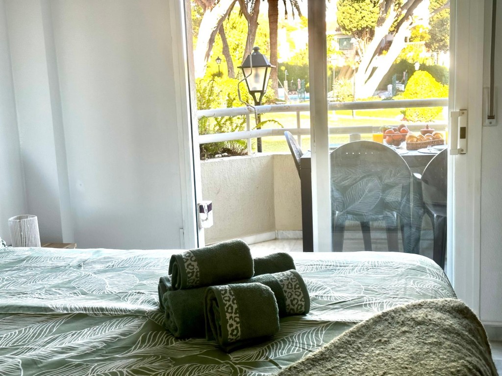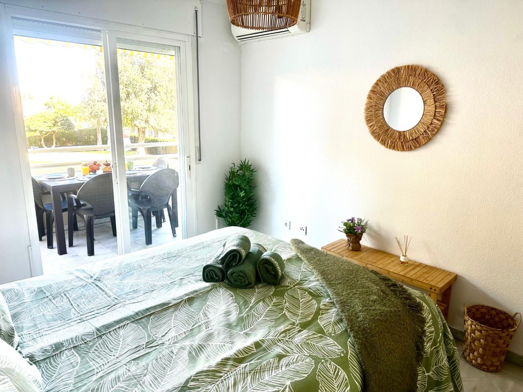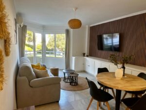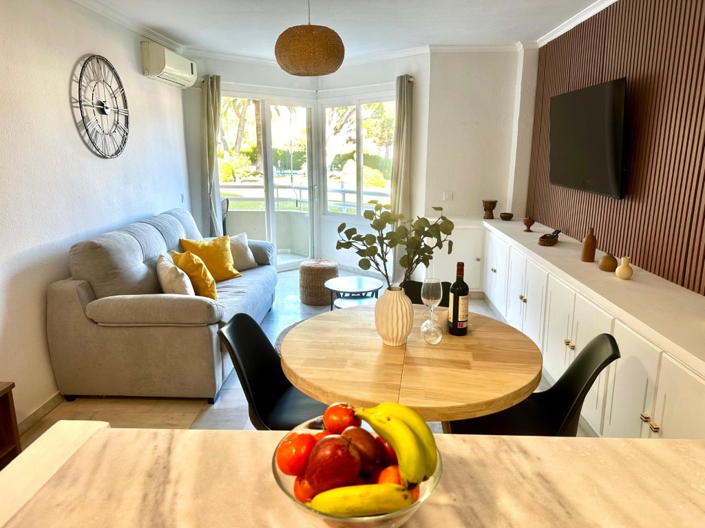 Cuenta con un dormitorio principal y un amplio salón-comedor lleno de luz natural, con vistas al cuidado jardín de la urbanización. El mobiliario es moderno y cómodo, incluyendo sofá cama, mesa de comedor y televisión de pantalla plana.