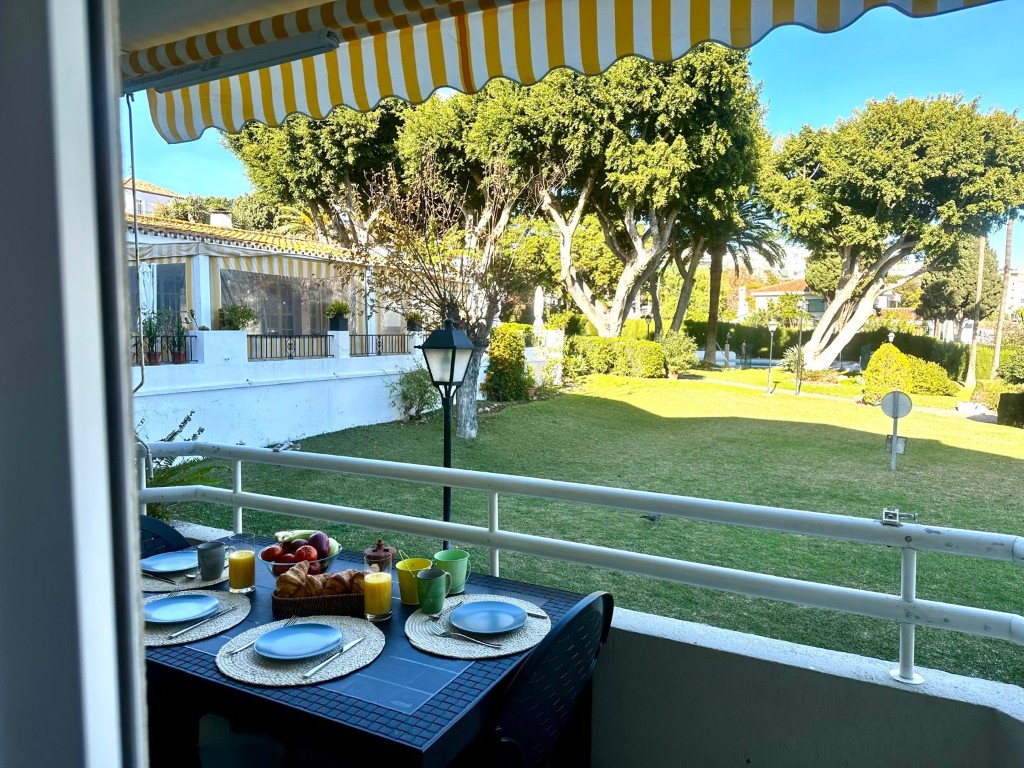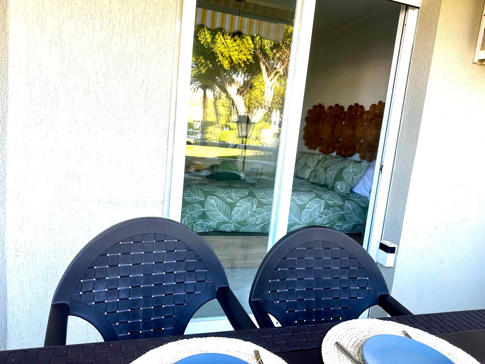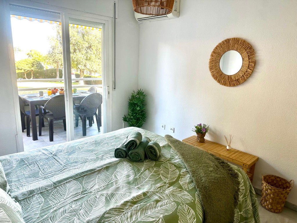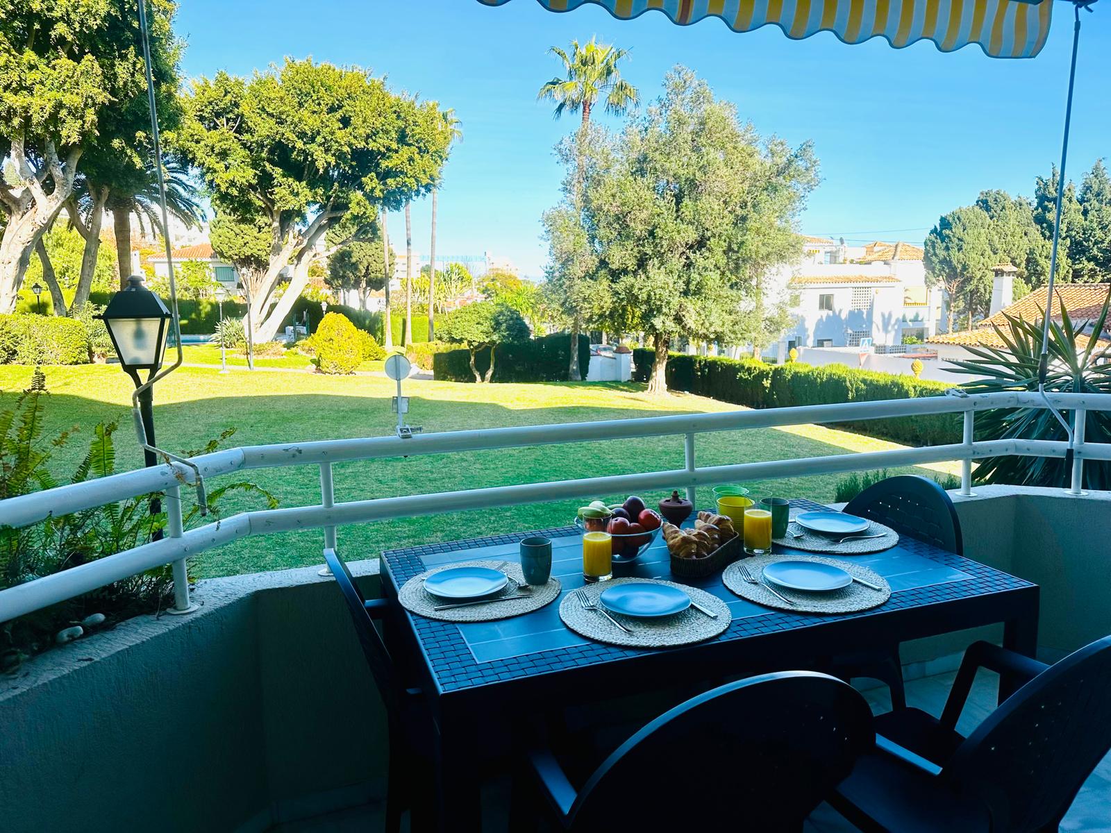 Cuenta con un dormitorio principal y un amplio salón-comedor lleno de luz natural, con vistas al cuidado jardín de la urbanización. El mobiliario es moderno y cómodo, incluyendo sofá cama, mesa de comedor y televisión de pantalla plana.