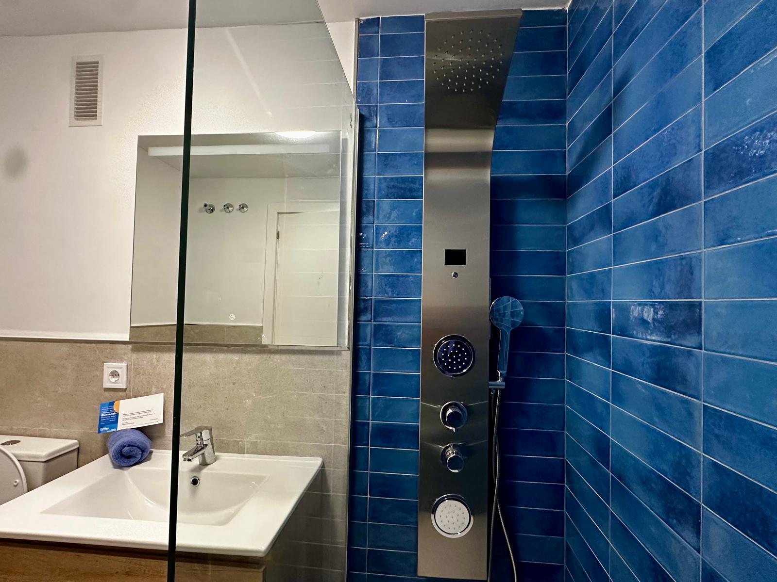 El dormitorio ofrece cama doble y amplio espacio de almacenamiento, y el baño dispone de ducha moderna y lavabo de diseño.